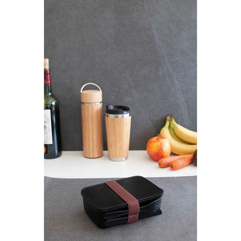 Lunch box NOONTIME: box with silicone-sealed lid, rubber band to keep the lid on tight, the band is designed to hold knife and fork, capacity approx. 700 ml, accessories (band + cutlery) delivered inside the box