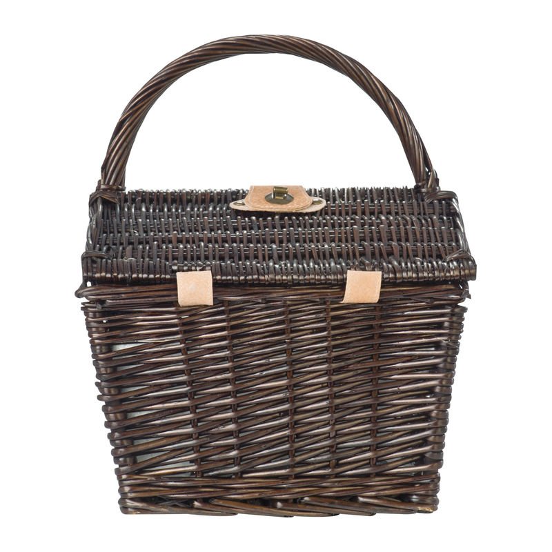 Willow picnic basket for two people, with stainless steel cutlery with plastic handles, two ceramic plates, and two 0.21 ml ceramic mugs.