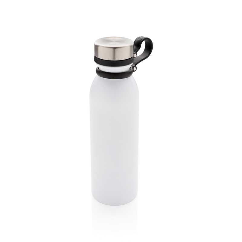 Nepropustná termo láhev s vakuovo měděnou izolací s černým silikonovým poutkem na nošení. Poutko je připevněno k víčku, čímž nehrozí jeho ztráta a není jej při pití třeba druhou rukou držet. Dvojstěnná vakuová konstrukce s měděnou izolací udrží nápoje až 8 horké a 24h studené. Konstrukce zabraňuje kondenzaci na vnější straně lahve. Objem: 600ml. Více barevných provedení. Bílá v odstínu Pantone Cool Gray 1