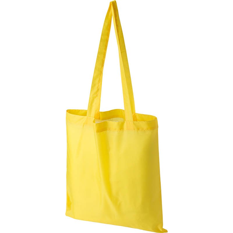 Skládací nákupní taška z RPET polyesteru, s etiketou s označením RPET.