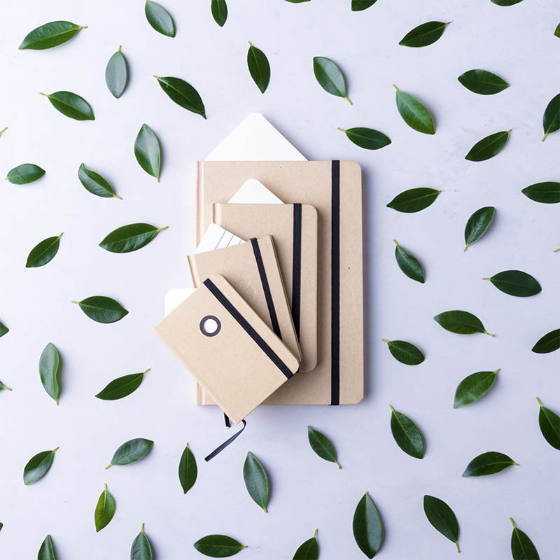 Na zakázku vyrobený blok A6 s deskami z recyklovaného kraftového papíru s 32 listy recyklovaného papíru. Cena zahrnuje celobarevně potištěný vnější obal, nezahrnuje tiskovou přípravu. Min. mn.: 100 ks.