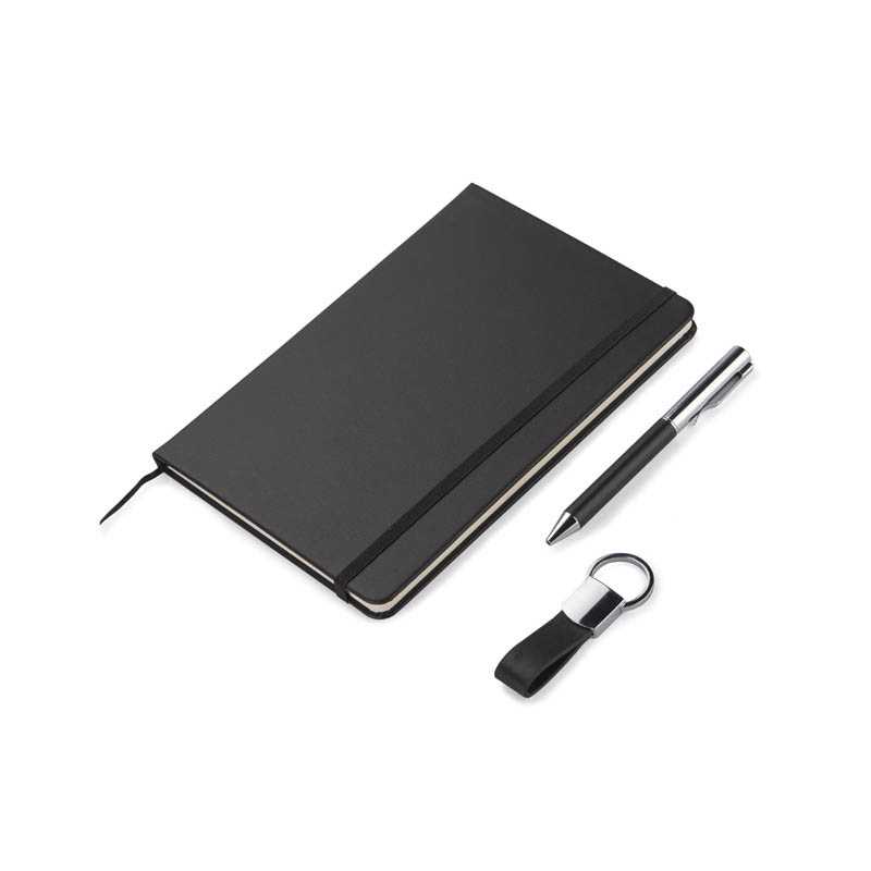 Sada PROBIZ se skládá ze zápisníku, pera a klíčenky. Zápisník má hladké stránky z kamenného papíru, formát A5. Klíčenka je vyrobena z kovu a ekokůže. Kuličkové pero s modrou náplní. Vše je zabaleno ve vkusné černé krabičce. Sada působí mimořádně elegantně.