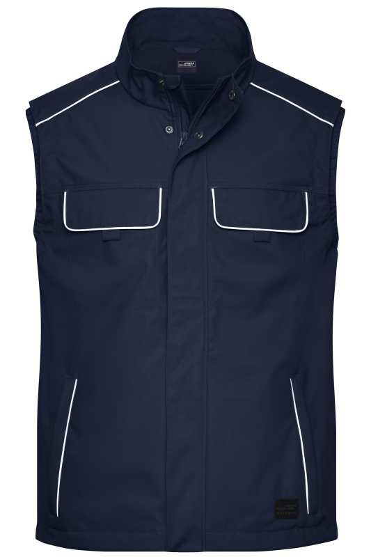 Pánská pracovní vesta James & Nicholson Workwear Vest.Profesionální vesta s vysokou kvalitou vybavení..Vnější látka: 65% polyester, 35% bavlna.Vnější materiál 2: 100% polyamid.Robustní a odolná směsová tkanina.Stojací límec s měkkým rounem uvnitř.Ramenní