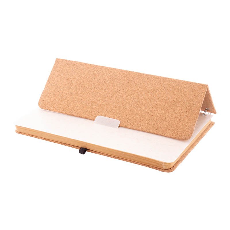 Spirálový blok A5 s deskami z přírodního korku s plastovým držákem na mobil a tablet z pšeničné slámy. Se 70 linkovanými listy z recyklovaného kraftového papíru, gumičkou a držákem na pero.