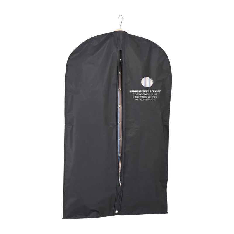Jednoduchý vak na šaty v černé barvě se zipem a s malým okénkem z PVC na levé straně. Způsob potisku vinylová nálepka.