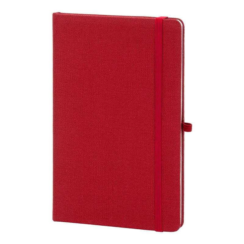 Zápisník velikosti A5 s plátěným vzhledem obalu, černým gumovým uzávěrem a záložkou. Obsahuje 160 linkovaných stran.