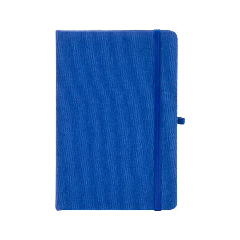 Zápisník velikosti A5 s plátěným vzhledem obalu, černým gumovým uzávěrem a záložkou. Obsahuje 160 linkovaných stran.