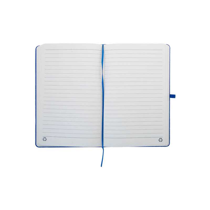 Blok potažený recyklovanou bavlnou s 80 linkovanými listy z recyklovaného papíru. Se záložkou v odpovídající barvě, gumičkou a držákem na pero. Velikost A5.