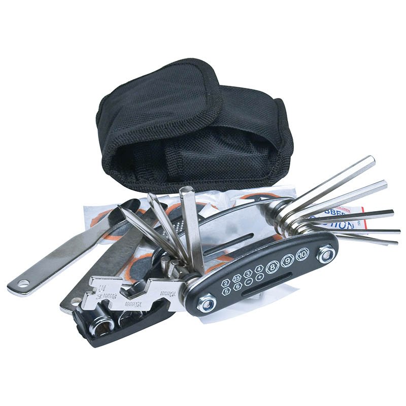 Velká 17 dílná sada na kolo, obsahuje například imbusový klíč, šroubovák a to vše zabalené v pouzdře z polyesteru.