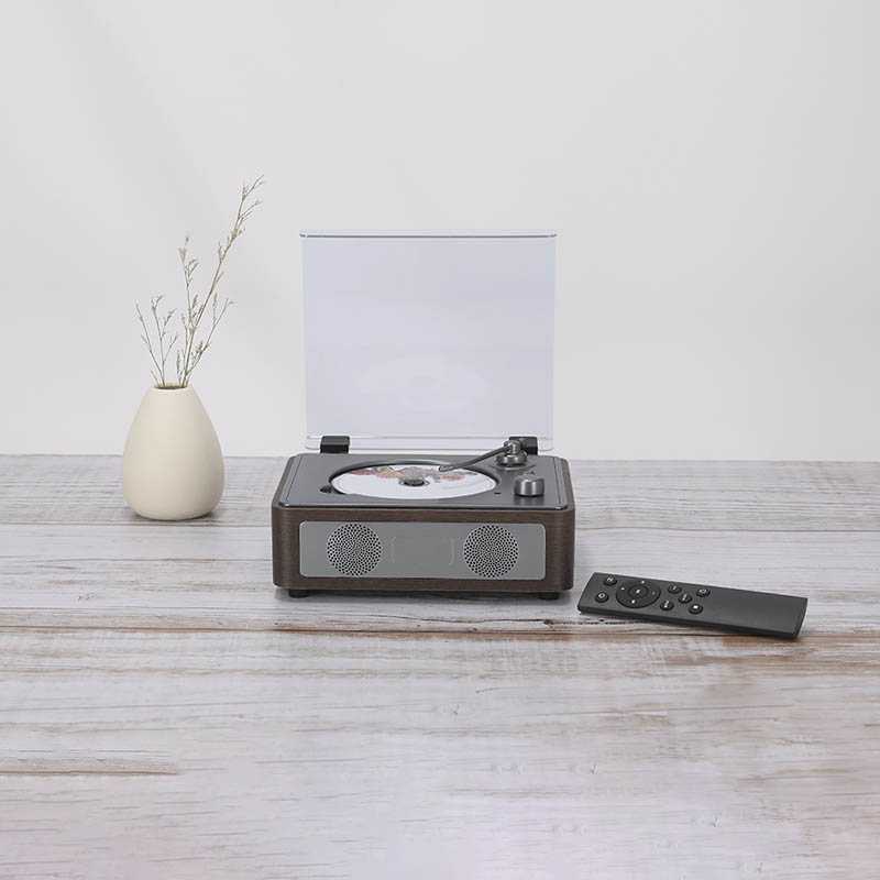 NOVINKA 2025. Retro CD player made from wood, allowing you to enjoy music while the disc spins under its clear acrylic cover. Equipped with a 2000 mAh battery, two built-in speakers, Bluetooth 5.3 connection, and USB, Type C, and headphone inputs. Offers intuitive handling with volume controls, playback, track change, and play/pause button, available on both the device and its remote control. User instructions available in Spanish and English.