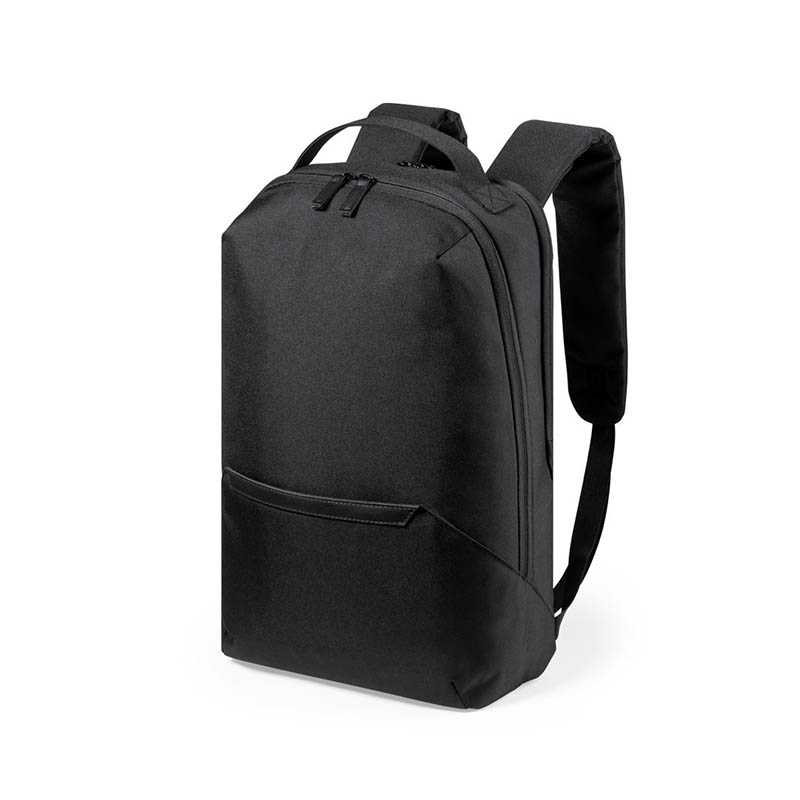 NOVINKA 2025. Backpack made in resistant 600D RPET polyester, made from recycled plastic, encouraging the reuse of plastic waste and helping the sustainability of the planet. Main compartment with double puller zipper closure and front pocket. Inside with padded pockets for tablets up to 10 inches and laptops up to 15 inches. Trolley attachment accessory, with anti-theft pocket on the back. Adjustable padded back and shoulder straps, with RPET label.
