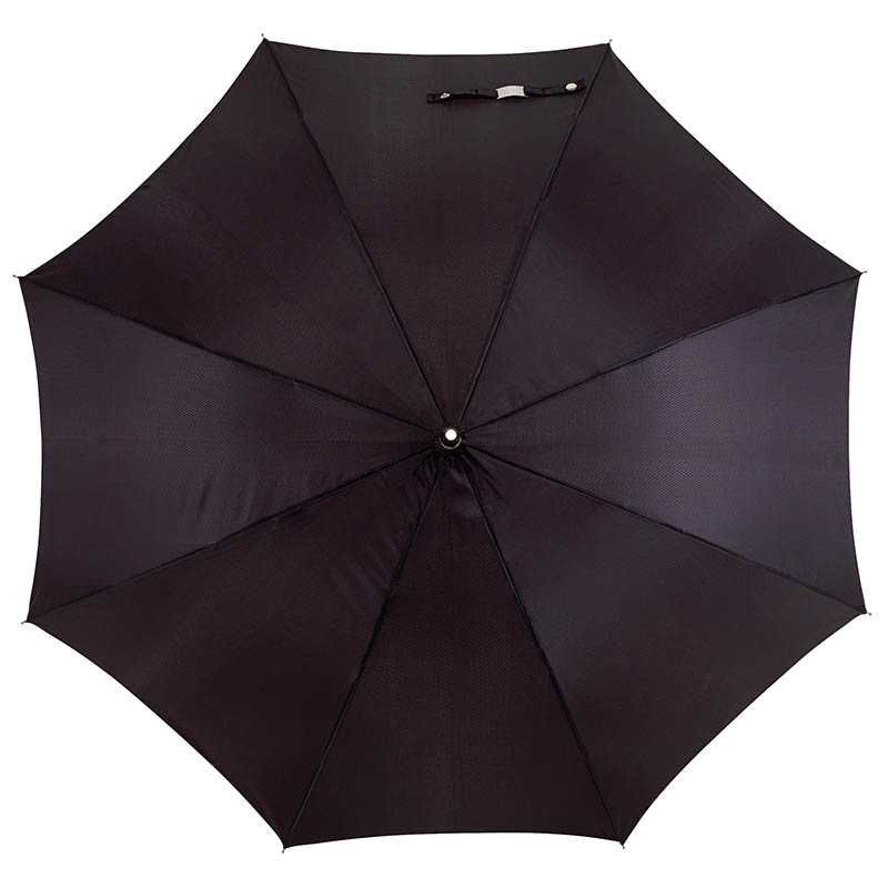 Vysokokvalitný dáždnik vyrobený z polyesteru 190T s čiernou kostrou zo sklených vlákien, elegantnou rukoväťou a automatickým otváraním po stlačení tlačidla.