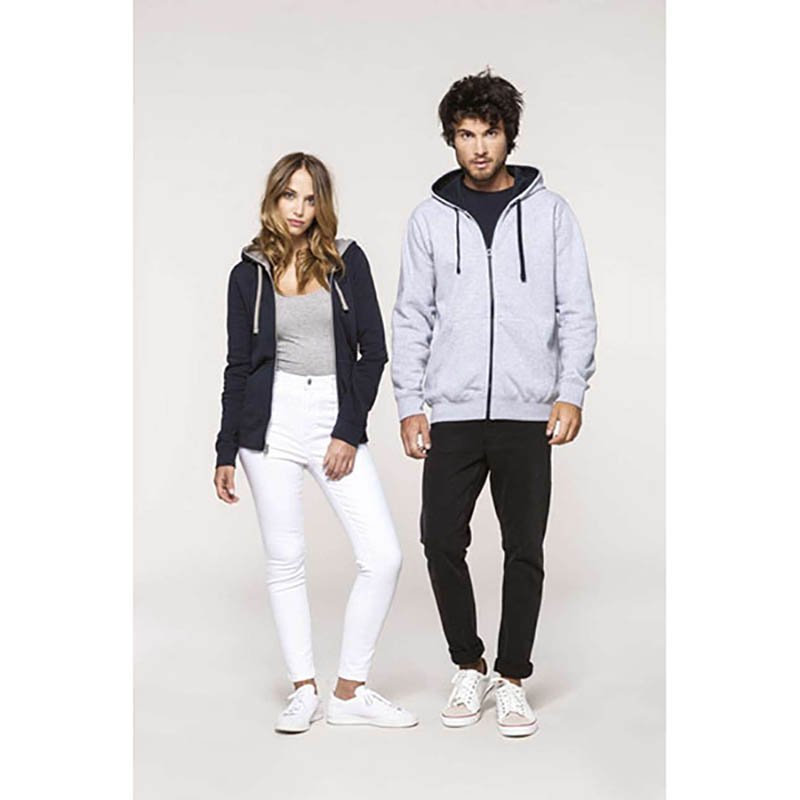 80 % česaná bavlna / 20 % polyester (Oxfordská šedá: 76 % česaná bavlna / 21 % polyester / 3 % viskóza).Česaný flís.Klokaní kapsa s otvorem pro sluchátka.Žebrované manžety a lem.Podšitá, kontrastní kapuce se stahovací šňůrkou.Kontrastní zapínání na zip.Certifikace v souladu s STANDARD 100 od OEKO-TEX®N° CQ1007/7, IFTH.