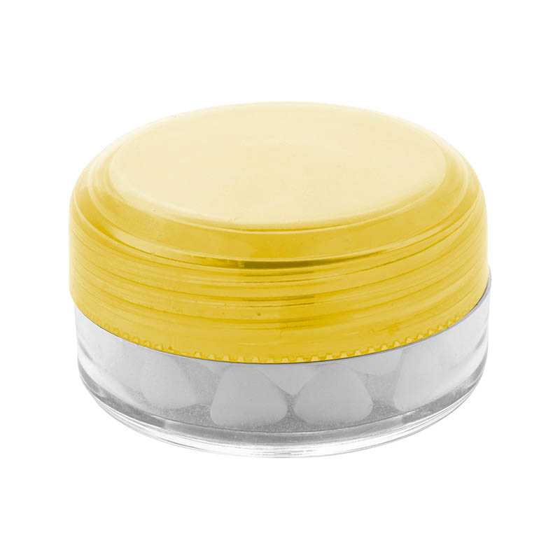 NOVINKA 2025. Kulatá průhledná plastová dóza s mintovými bonbóny s barevným šroubovacím víčkem. Obsahující cca. 12 gramů mentolových bonbonů bez cukru.