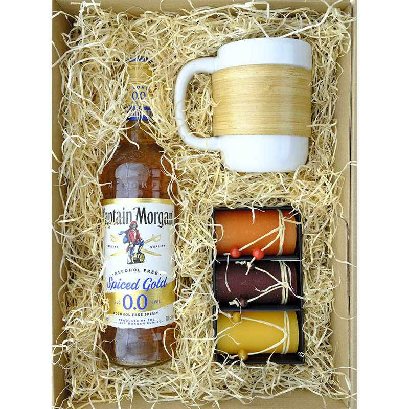 Darčeková krabica > prírodná >36x26x10 cm, Súprava parfémovaných sviečok > hnedá, Nealkoholický rum Captain Morgan Spiced Gold Alcohol Free 0,7 l, Keramický hrnček 450 ml > biela