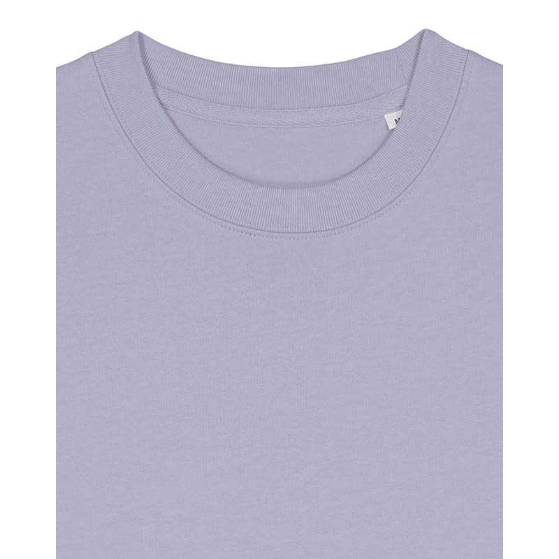 Set-in sleeve 1x1 rib at neck collar, sleeve hem and bottom hem Inside herringbone back neck tape Flatlock topstitch on all seams Self fabric half moon at back neck