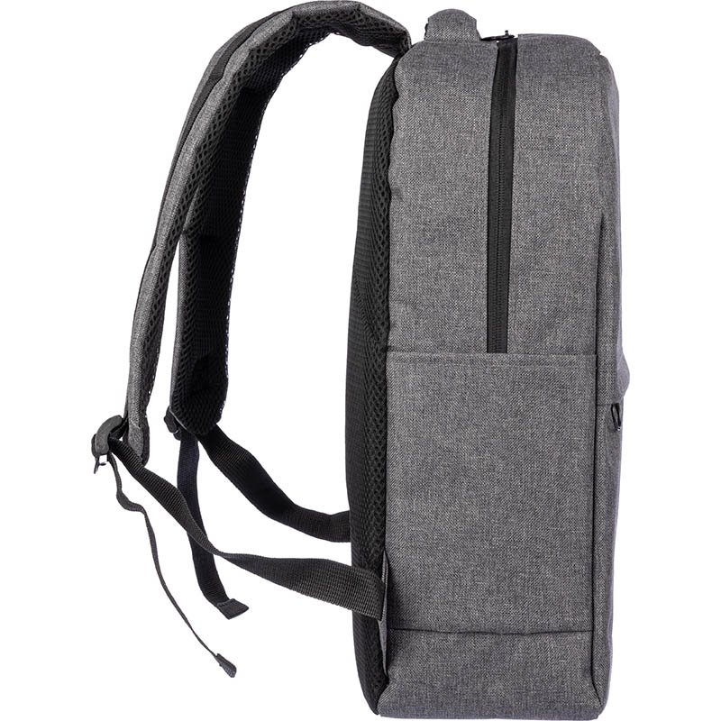 NOVINKA 2025. rPET (600D) backpack with USB port opening (and USB cable inside) with a large zippered compartment on the topside and a zippered pocket on the front side. Inside, there is a compartment for 10-inch devices and one for 15-inch devices. With
