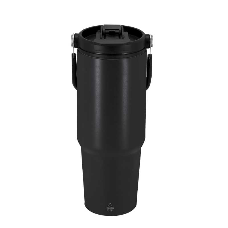 NOVINKA 2025 XMASS. Insulated cup with 900 ml capacity. Made of Recycled Stainless Steel. Features a dual drinking system: spout with hermetic closure and integrated straw, adapting to user preferences. With hermetic sealing lid. Includes practical carryi