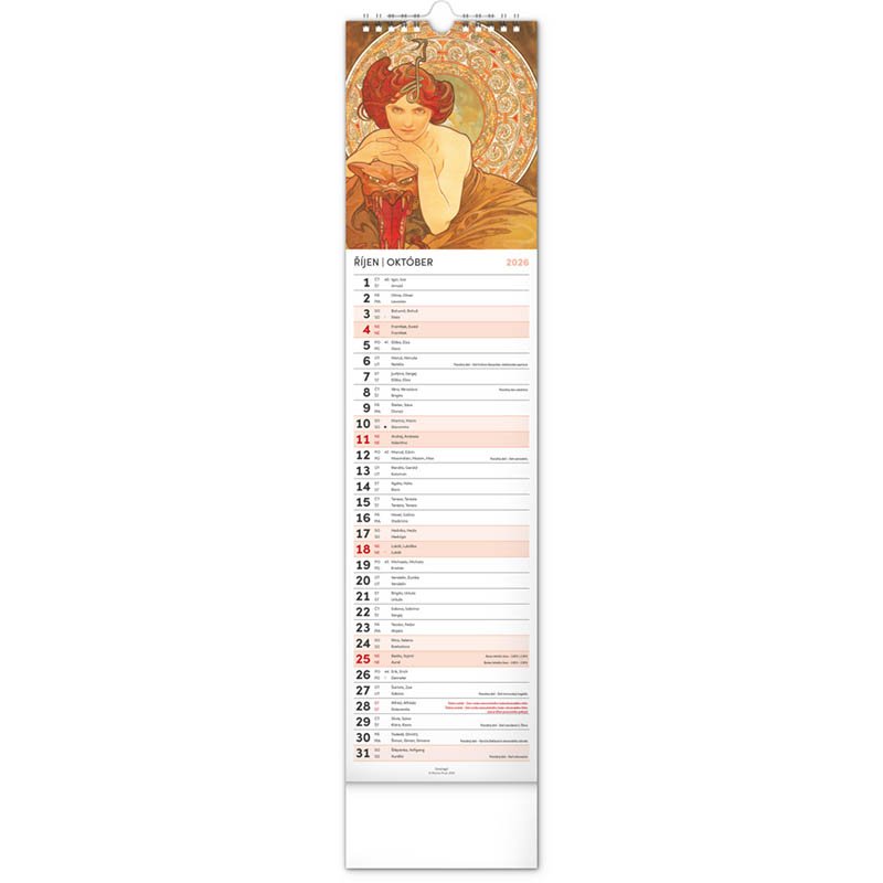 Česko-slovenský nástěnný kalendář v kravatovém formátu s reprodukcemi obrazů oblíbeného secesního malíře českého původu.