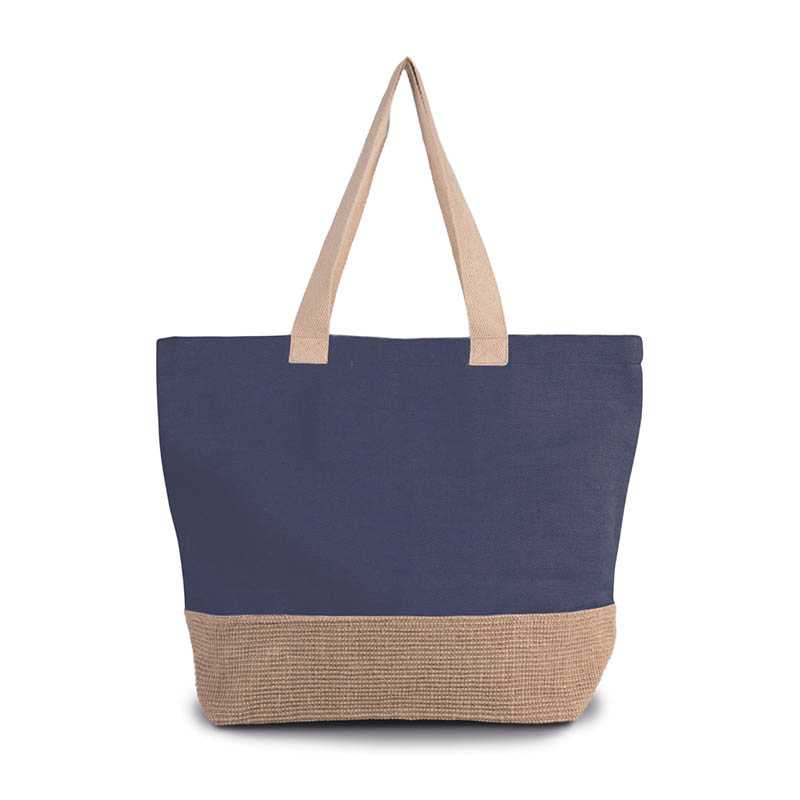 Velká nákupní taška z bavlny a juty (juco) s kontrastním přírodním jutovým dnem.Příze juco i juta mají „rustikální“ vzhled.Vnitřní vrstva na zip.Magnetické zapínání na cvočky.