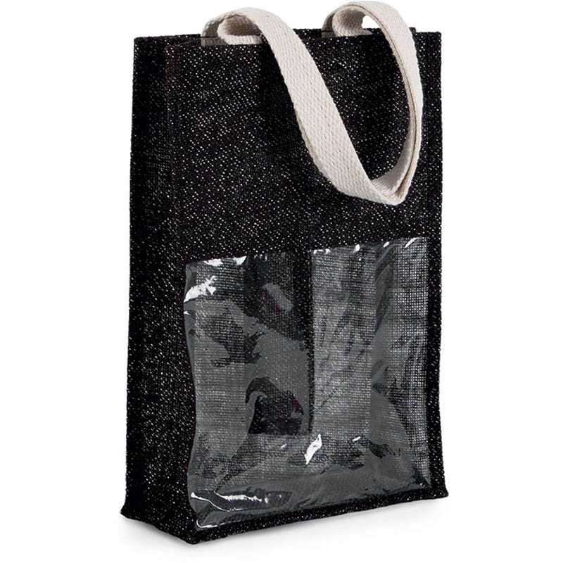 Jutová plátěná taška na láhve s 2 uchy a průhledným okénkem na přední straně.Určeno pro 2 lahve.